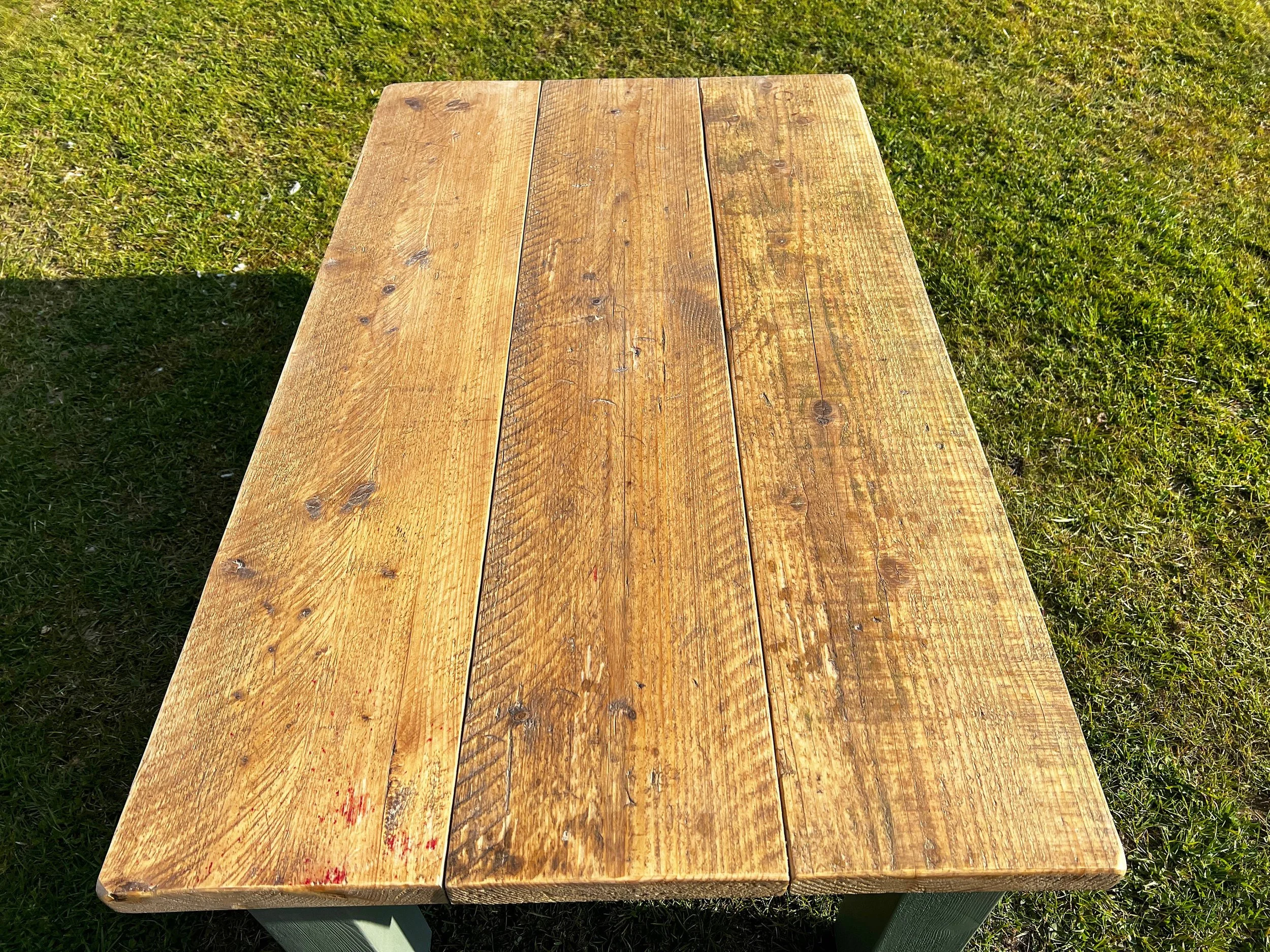 This handmade farmhouse garden Coffee table is made from reclaimed and recycled scaffolding boards. The timber has been sanded down to make a smooth finish but with the age and characteristics that make the table unique have been kept. The table is finished with a teak oil and an osmo varnish which protects the wood, brings out the grain and creates a smooth finish. This means that the table is suitable for inside use as a dining table and outside as a garden table. The table legs have been painted with an exterior paint which creates a beautiful contrast between the table top and legs.